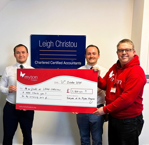 With generous support from colleagues, friends and the unfailing generosity of Leigh Christou clients, the pair raised £1,560, bringing Leigh Christou’s total fundraising to an impressive £10,870. A cheque presentation was recently held at the Coventry office, where Martin Watts, Corporate Fundraiser at The Myton Hospices, accepted the donation from Matty and Ryan.